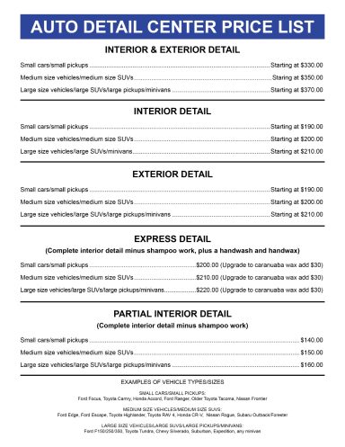 All detailing packages have a starting price. We can not give a firm price quote without seeing a vehicle in person. Every vehicle requires a different level of care and cleaning. Please stop by, Monday through Friday between 7:45 am - 4:00 pm, and one of our auto detailing technicians would be glad to provide you a quote.