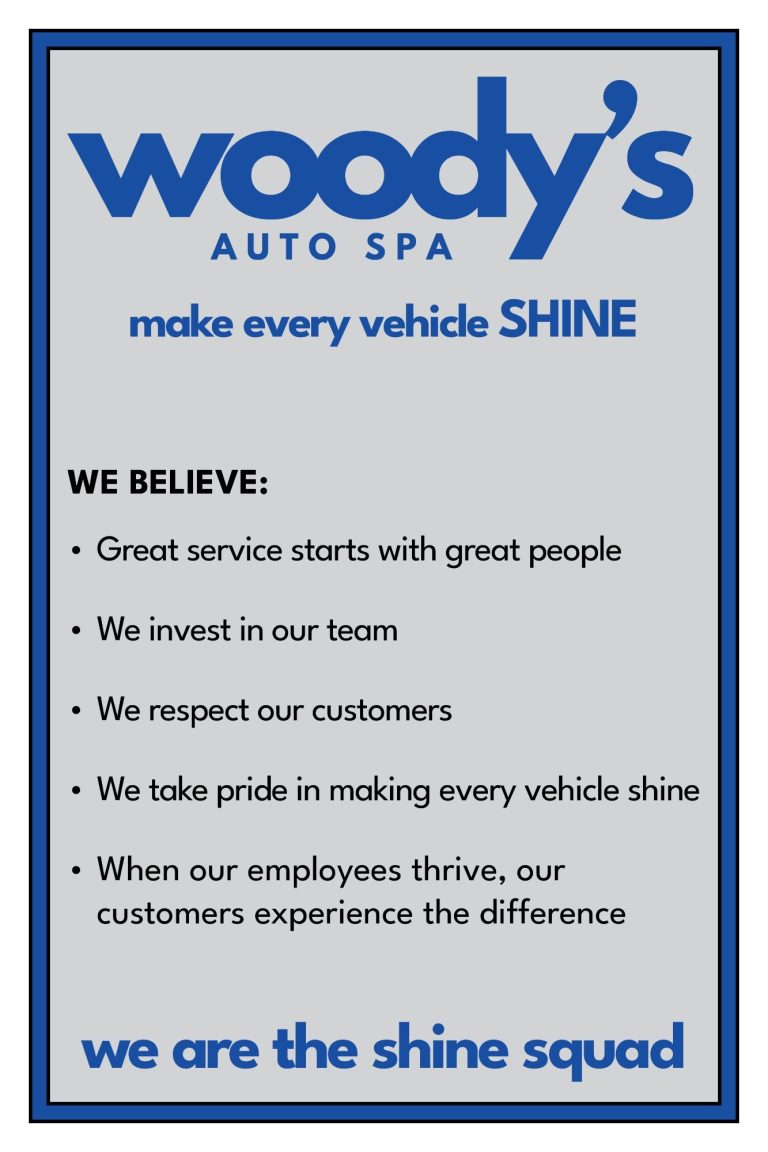 At Woody's Auto Spa, we believe great service starts with great people. We invest in our team, we respect our customers and we take pride in making every vehicle SHINE. When our employees thrive, our customers experience the difference.